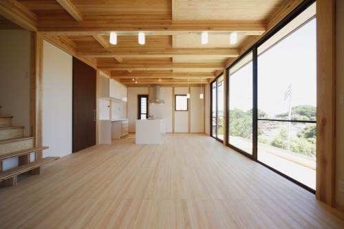 リビング側に幅2.7mのワイドサッシを採用。高断熱のLow-E複層ガラス越しに陽光が注ぐ