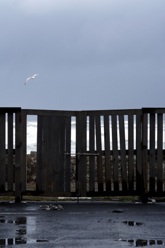 銭函駅の真正面は海。柵の向こうには、多分荒れた海がある。風も強くてカモメが流されていた。