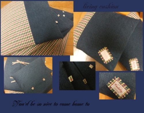 無地7m、チェック5m・・・かなり昔から生地棚を占領していたこの二種類の布をひっぱりだしてきて、リビングの座布団とクッションカバーを作りました。